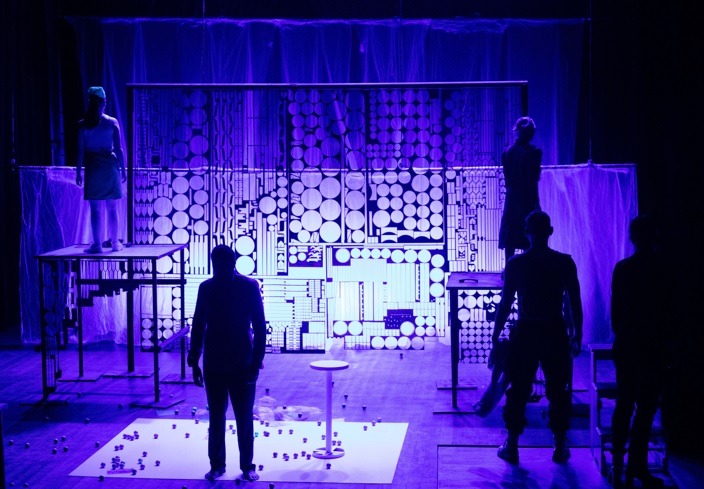 En escena, seis intérpretes construyen un universo fragmentado donde lo íntimo se vuelve público. La escenografía incorpora elementos industriales —ventiladores, plásticos y superficies metálicas— que configuran un espacio simbólico de encierro y exposición, reforzado por el uso de luces y materiales translúcidos.